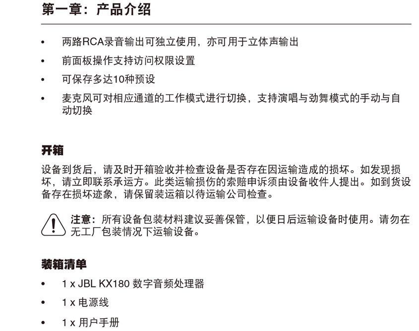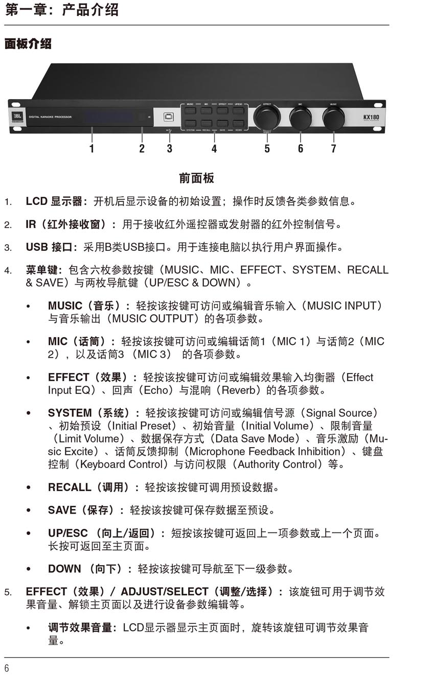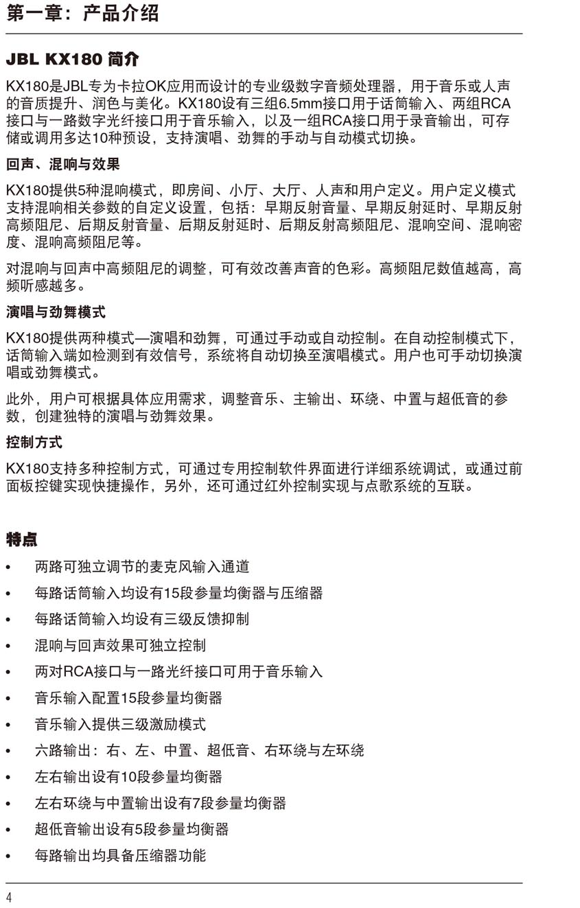 KX180是JBL專為卡拉OK應(yīng)用而設(shè)計(jì)的專業(yè)級(jí)數(shù)字音頻處理器,用于音樂(lè)或人聲的音質(zhì)提升、潤(rùn)色與美化。KX180設(shè)有三組6.5mm接口用于話筒輸入、兩組RCA 接口與一路數(shù)字光纖接口用于音樂(lè)輸入,以及一組RCA接口用于錄音輸出,可存儲(chǔ)或調(diào)用多達(dá)10種預(yù)設(shè),支持演唱、勁舞的手動(dòng)與自動(dòng)模式切換。