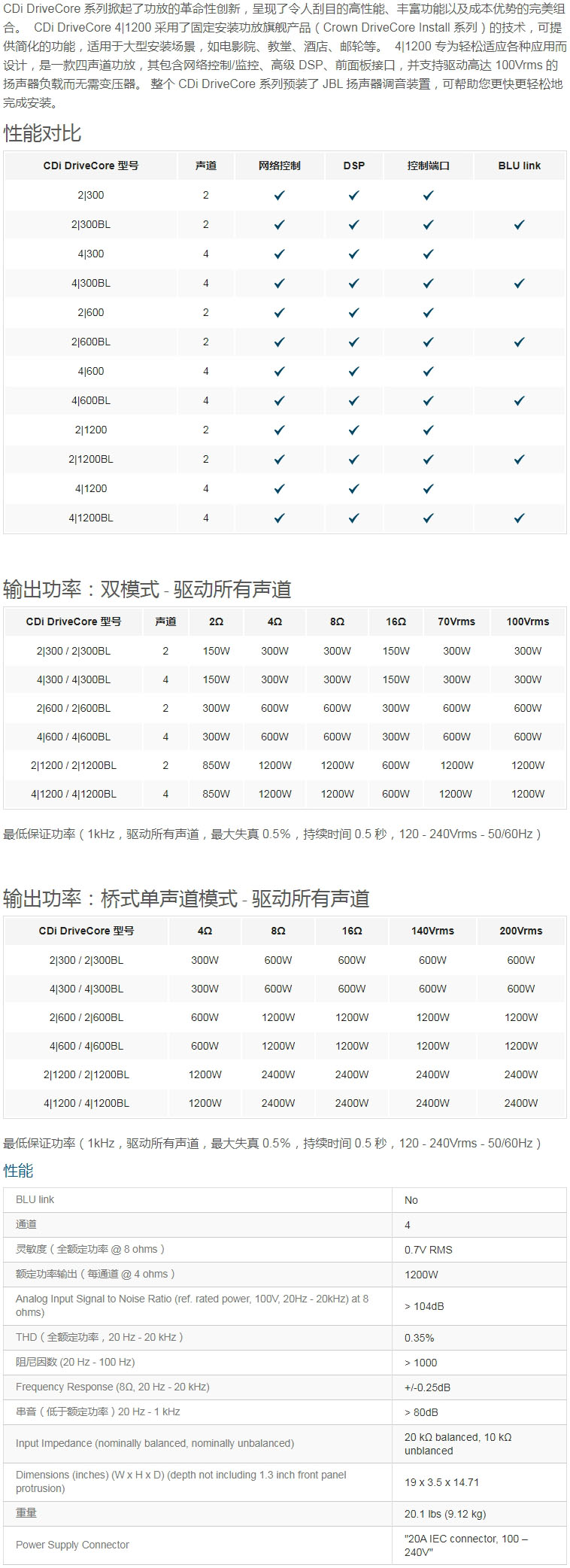 CDi DriveCore系列掀起了功放的革命性創(chuàng)新,呈現(xiàn)了令人刮目的高性能、豐富功能以及成本優(yōu)勢的完美組合。CDi DriveCore 4|1200采用了固定安裝功放旗艦產(chǎn)品(Crown DriveCore Install系列)的技術(shù),可提供簡化的功能,適用于大型安裝場景,如電影院、教堂、酒店、郵輪等。4|1200專為輕松適應各種應用而設計,是一款四聲道功放,其包含網(wǎng)絡控制/監(jiān)控、高級DSP、前面板接口,并支持驅(qū)動高達100Vrms的揚聲器負載而無需變壓器。整個CDi DriveCore系列預裝了JBL揚聲器調(diào)音裝置,可幫助您更快更輕松地完成安裝。