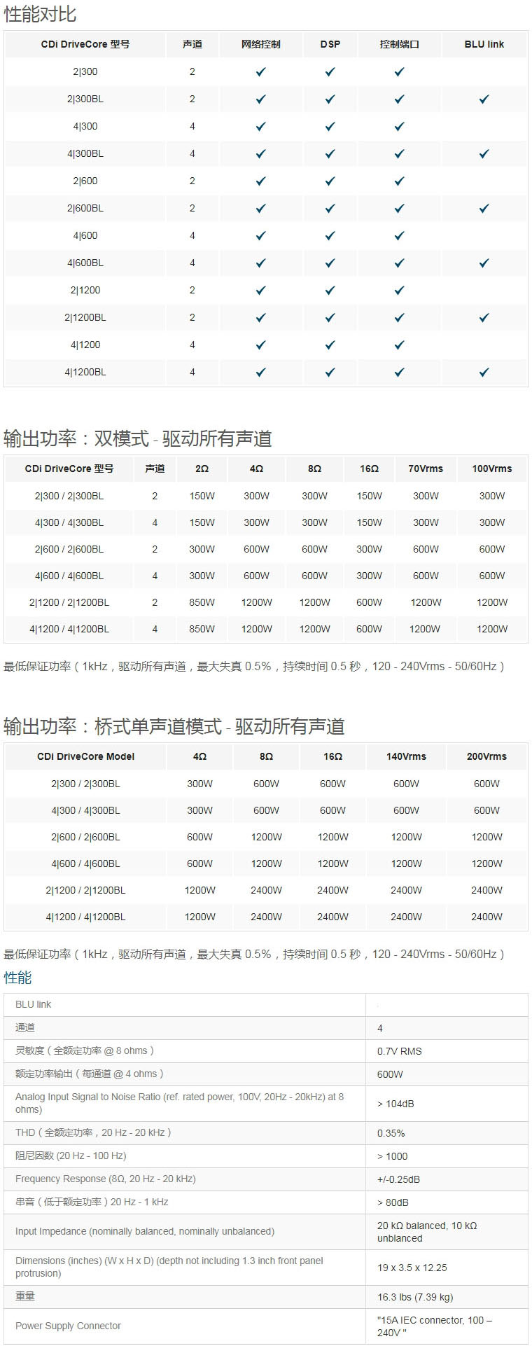 模擬 + BLU link 輸入,4個聲道,600W/輸出聲道