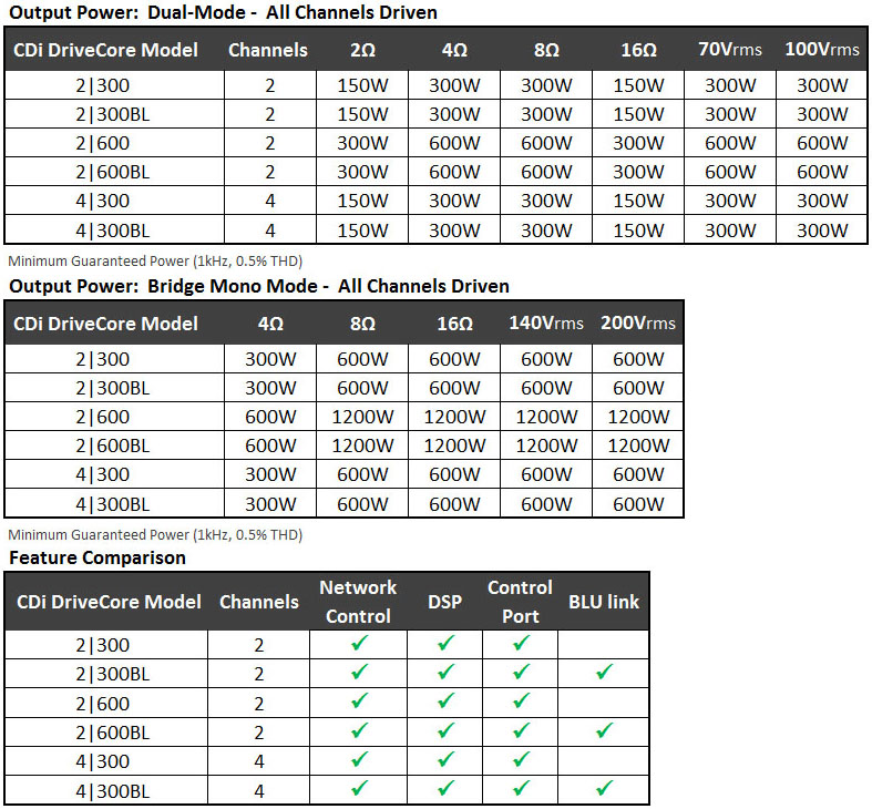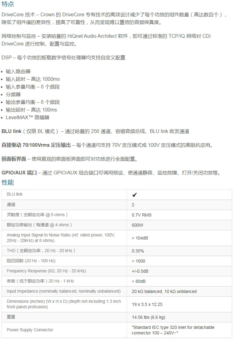 CDi DriveCore 系列掀起了功放的革命性創(chuàng)新,呈現(xiàn)了令人刮目的高性能、豐富功能以及成本優(yōu)勢的完美組合。CDi DriveCore采用哈曼旗艦固定安裝功放(Crown DriveCore Install系列)技術(shù),簡化了功能,幾乎適用于任何中小型固定安裝、電影院、零售店等應(yīng)用場合。CDi DriveCore系列設(shè)計(jì)旨在各種應(yīng)用場景中運(yùn)用自如,擁有2或4通道配置,以及網(wǎng)絡(luò)控制/監(jiān)控、高電平DSP、前面板界面等,且無需外接變壓器也能驅(qū)動(dòng)高達(dá)100Vrms定壓模式的揚(yáng)聲器。此外,使用BLU link(BL模式)還可改變通道數(shù)/輸出功率,實(shí)現(xiàn)了通過哈曼數(shù)字音頻總線收發(fā)通道的功能。