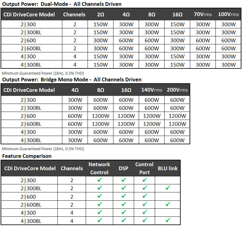 CDi DriveCore系列掀起了功放的革命性創(chuàng)新,呈現(xiàn)了令人刮目的高性能、豐富功能以及成本優(yōu)勢的完美組合。CDi DriveCore采用哈曼旗艦固定安裝功放(Crown DriveCore Install系列)技術(shù),簡化了功能,幾乎適用于任何中小型固定安裝、電影院、零售店等應(yīng)用場合。CDi DriveCore系列設(shè)計旨在各種應(yīng)用場景中運用自如,擁有2或4通道配置,以及網(wǎng)絡(luò)控制/監(jiān)控、高電平DSP、前面板界面等,且無需外接變壓器也能驅(qū)動高達(dá)100Vrms定壓模式的揚聲器。此外,使用BLU link(BL模式)還可改變通道數(shù)/輸出功率,實現(xiàn)了通過哈曼數(shù)字音頻總線收發(fā)通道的功能。